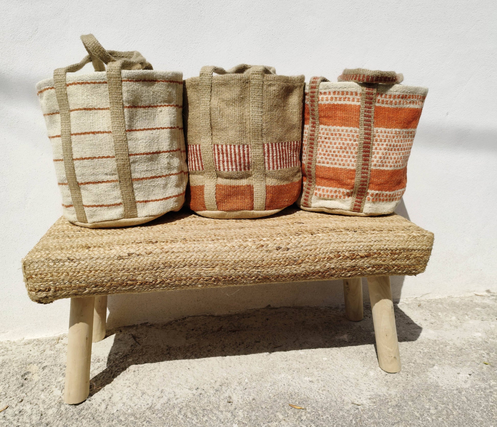 Los bolsos de yute artesanales de la India son piezas únicas y ecológicas, elaboradas con fibras naturales obtenidas de la planta de yute. Estos bolsos destacan por su durabilidad y resistencia, además de ser biodegradables y sostenibles, lo que los convierte en una opción responsable con el medio ambiente.Cada bolso de yute es una muestra del trabajo manual de comunidades locales. MEDIDAS:40X31CM/BASE 28CM ASAS:15CM
