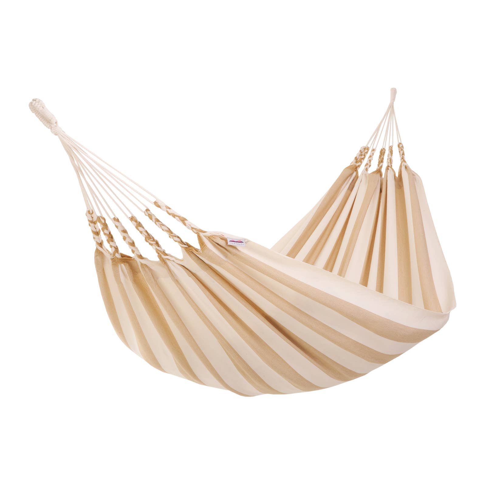 Las hamacas Cool Summer son hamacas de algodón con rayas en colores suaves. Ccol Summer Sand viene con rayas en un marrón arenoso fresco. Esta hamaca de tamaño mediano tiene una tela de 230 x 130 cm, que es muy cómoda para una persona. La hamaca mide unos 340 cm de bucle a bucle. Todas las hamacas Naya Nayon están hechas artesanalmente en Ecuador y de calidad garantizada.