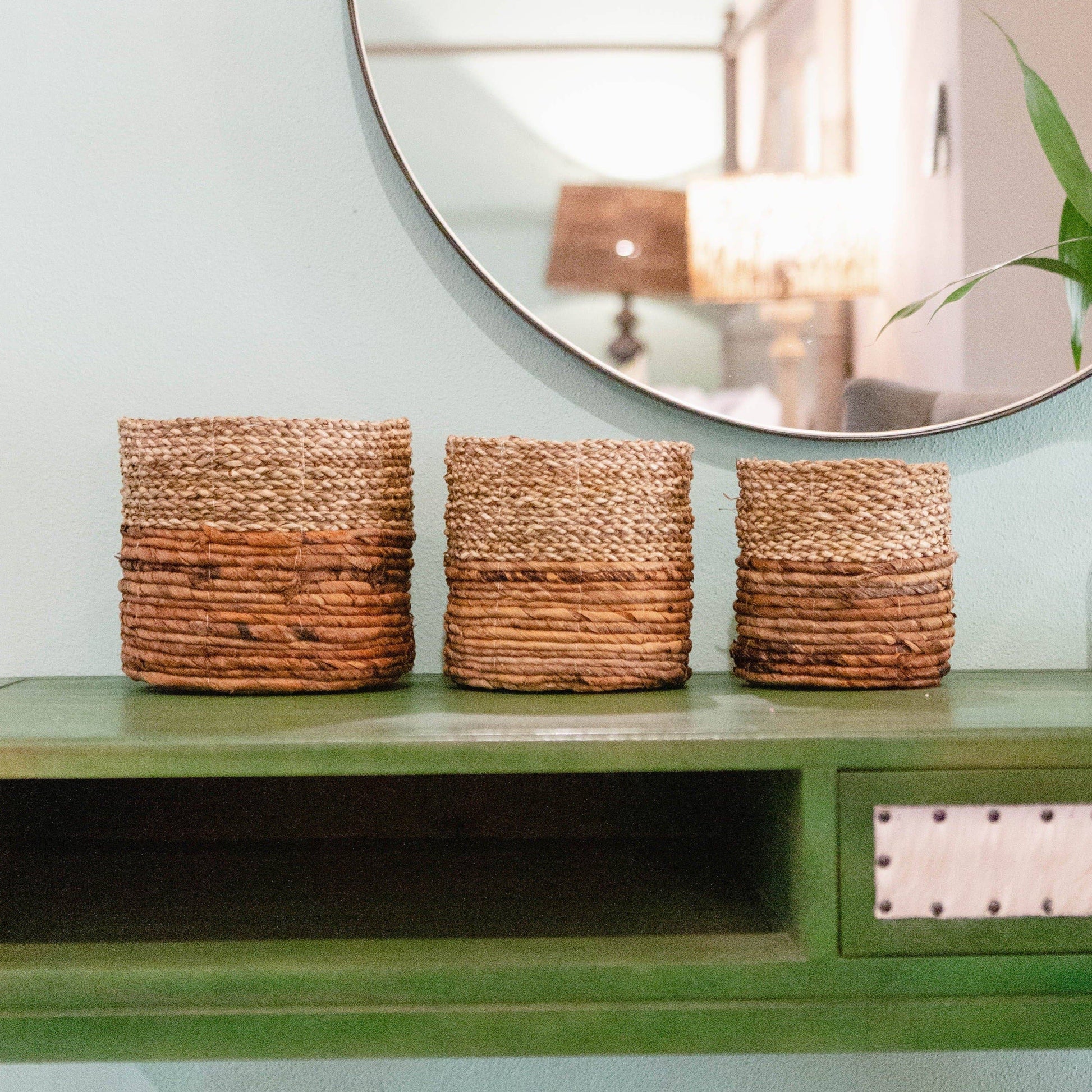 Set de 3 cestas artesanales elaboradas con fibra de plátano y hierba marina. Perfectas para colocar plantas o para usarlas como cestas de almacenamiento con un estilo natural y decorativo.